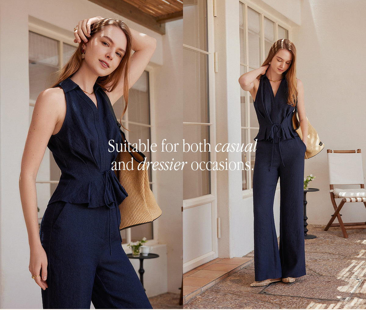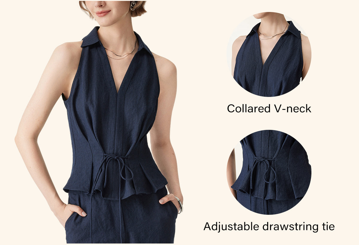 • 2Pcs Set Collared V-neck Sleeveless Top & Mid Rise Flared Pant with Pockets