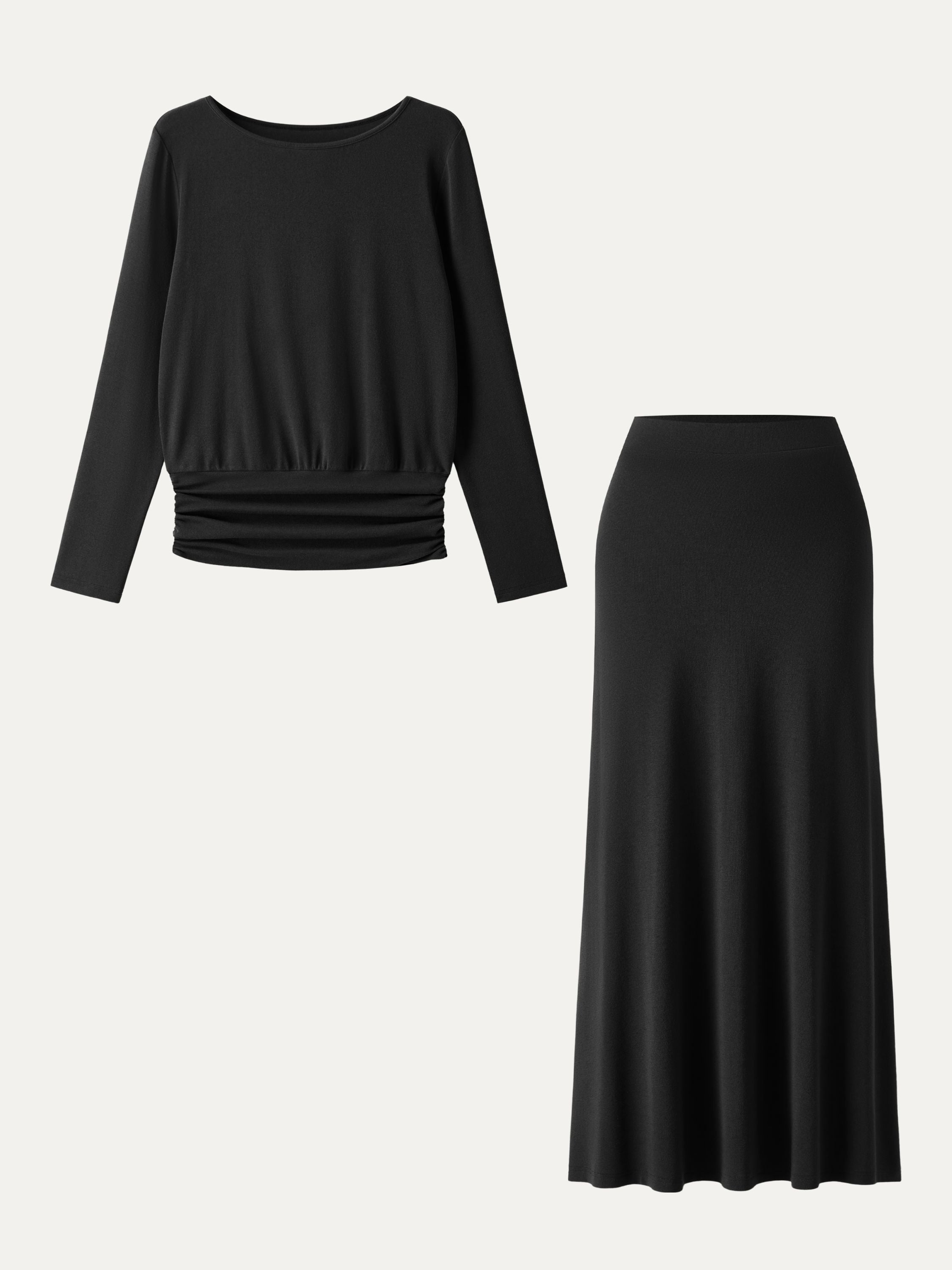• 2Pcs Set Light Warm Round Neck Side Ruched Top & Pull-on Circle Flared Maxi Skirt