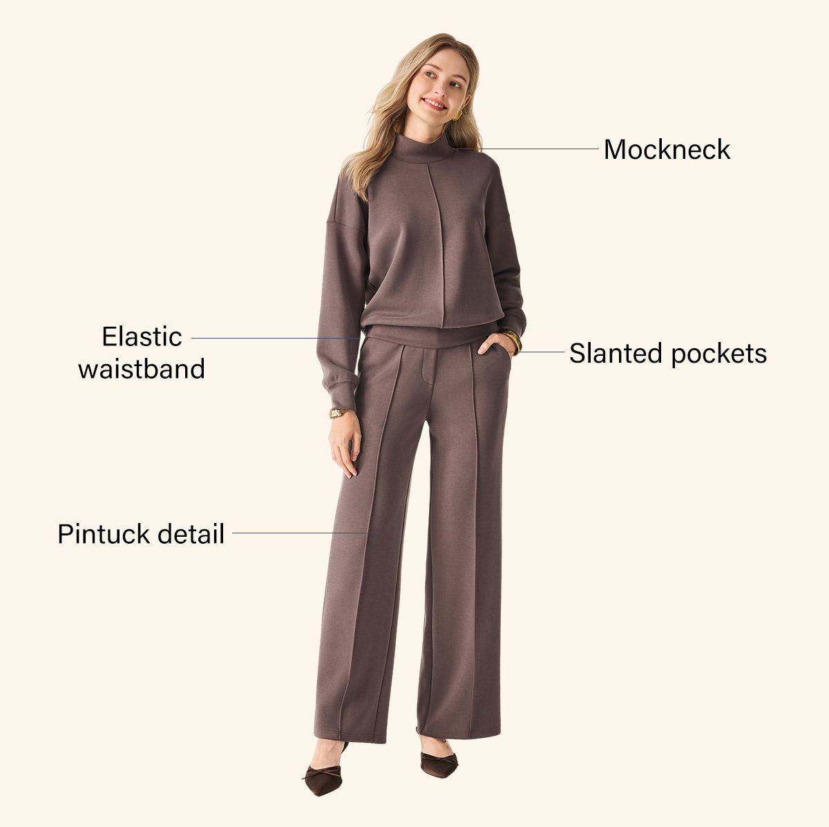 • 2Pcs Set Mockneck Pullover Shirt & Mid Rise Straight Leg Pants with Pockets