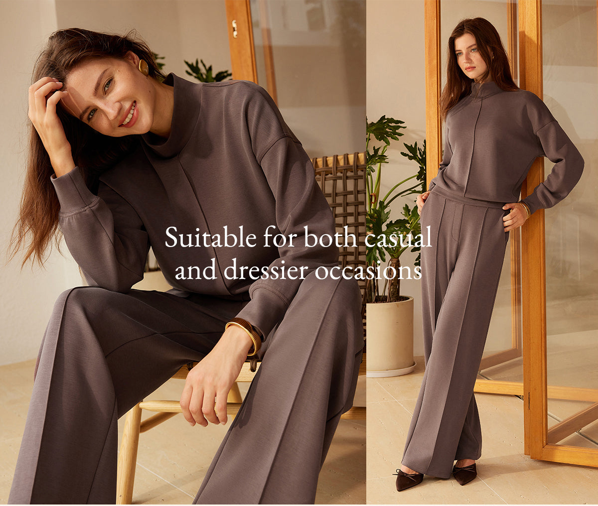 2Pcs Set Mockneck Pullover Shirt & Mid Rise Straight Leg Pants with Pockets