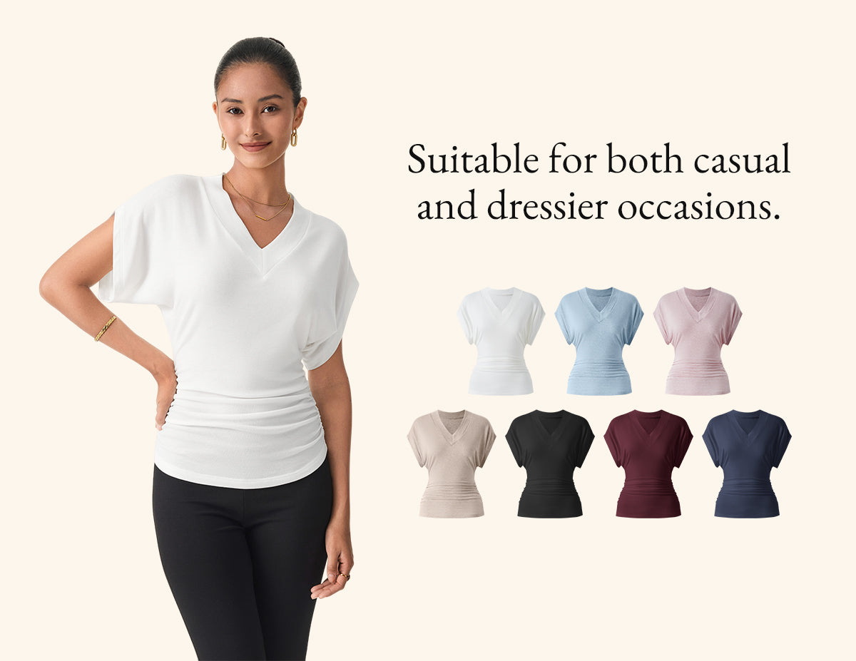 • Semi-sheer Lyocell Cashmere Blend V-neck Short Sleeve Side Ruched Tee
