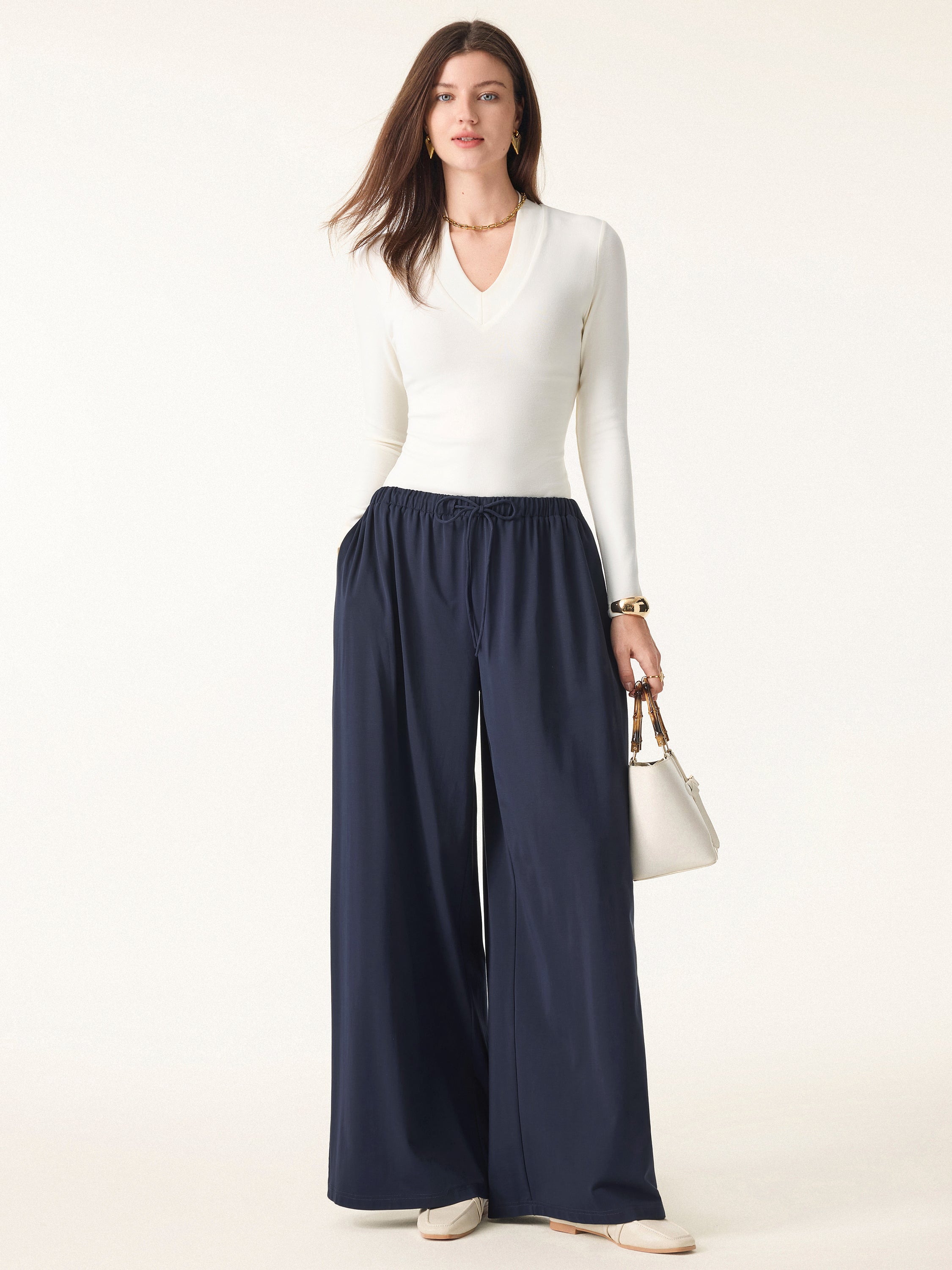 Stretch Ponte Mid Rise Palazzo Pants with Pockets