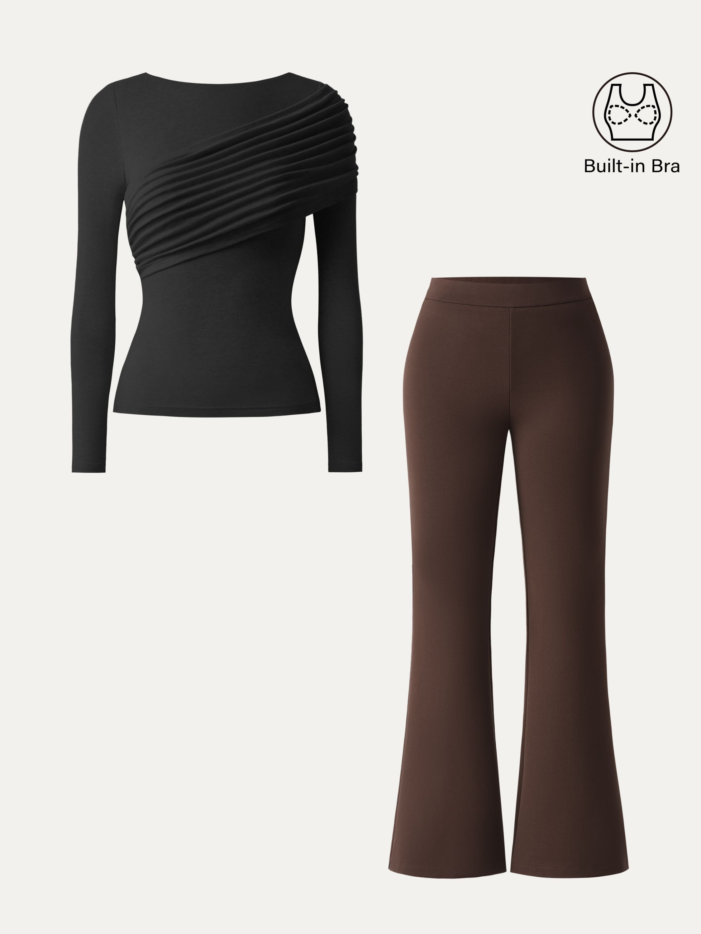 • 2Pcs Set Gathered Long Sleeve Brami & High Rise Pull-on Flared Petite Pants