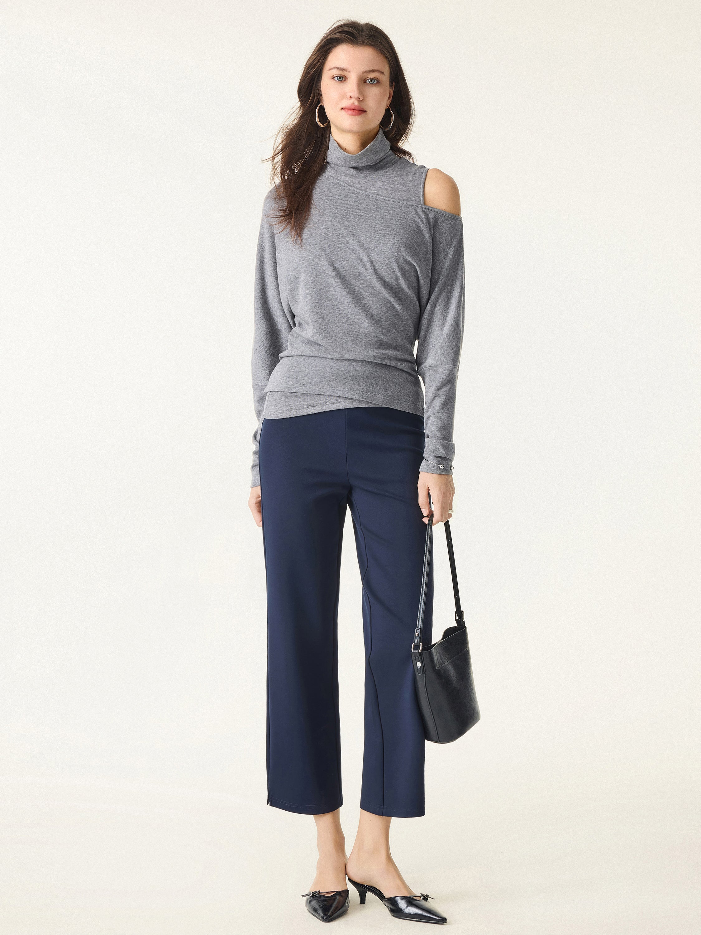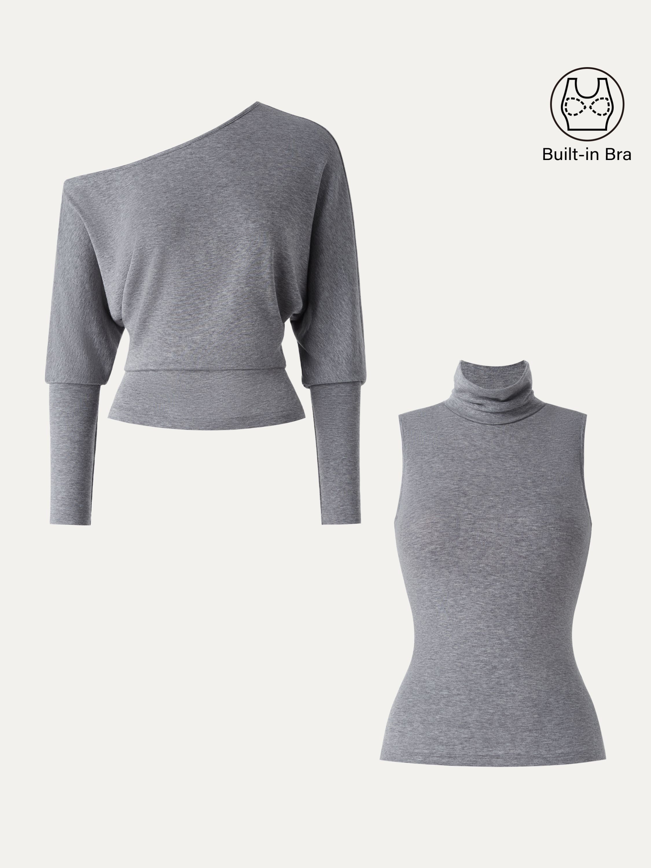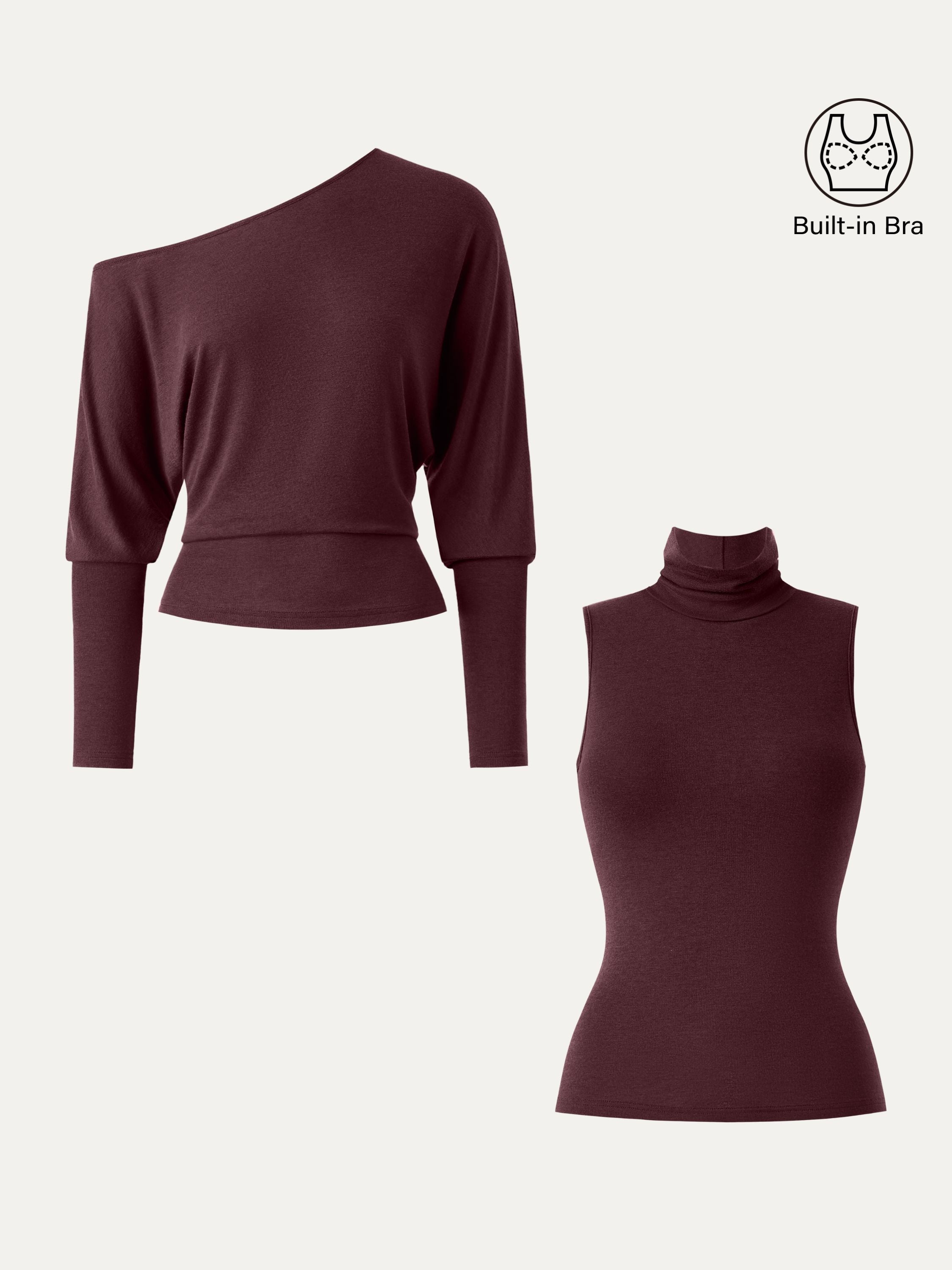 • 2Pcs Set Lyocell Cashmere Cold-Shoulder Semi-Sheer Top & Turtleneck Brami Tank