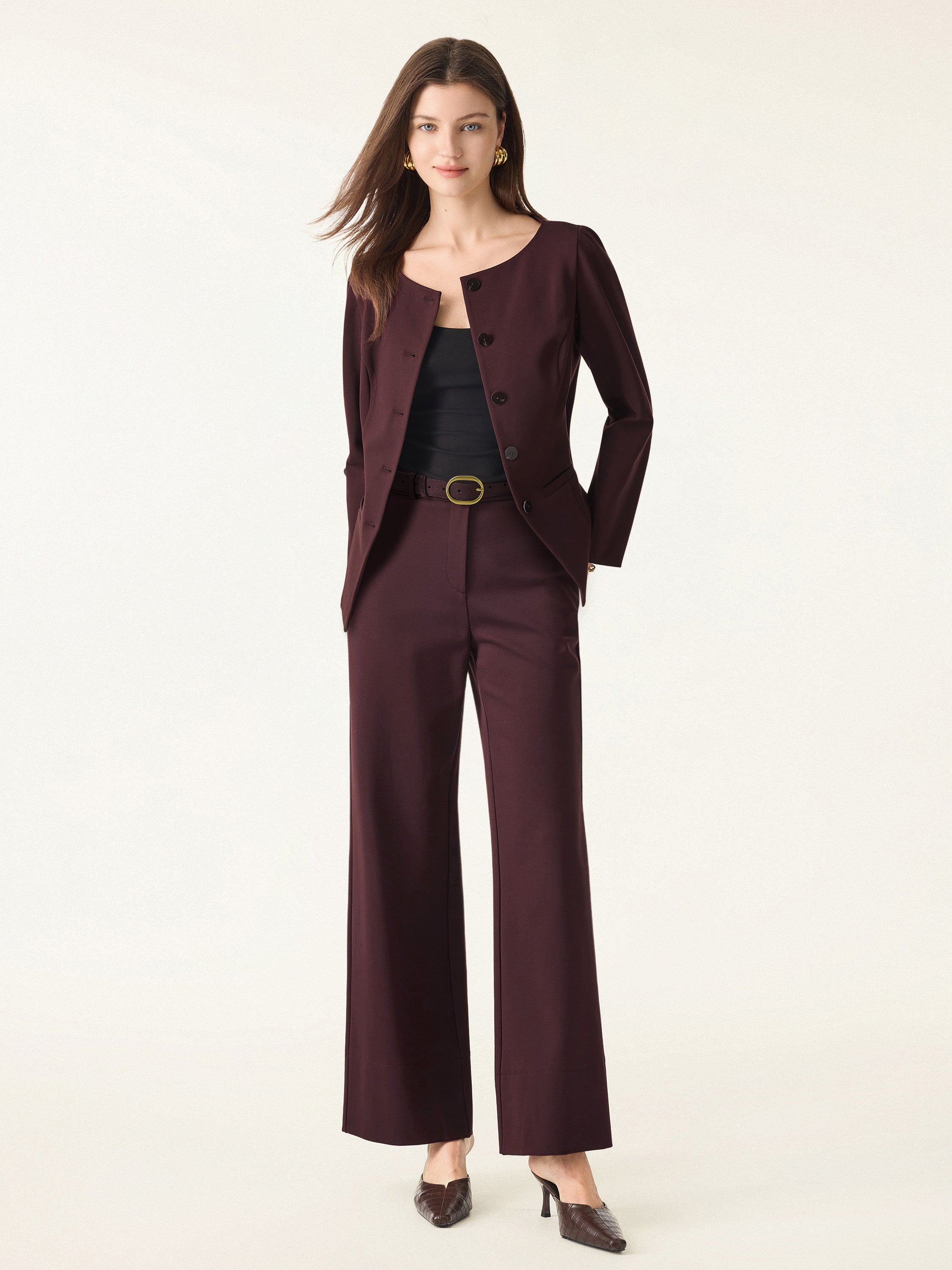 2Pcs Set Boatneck Blazer & High Rise Wide Leg Trousers with Zippered Pockets