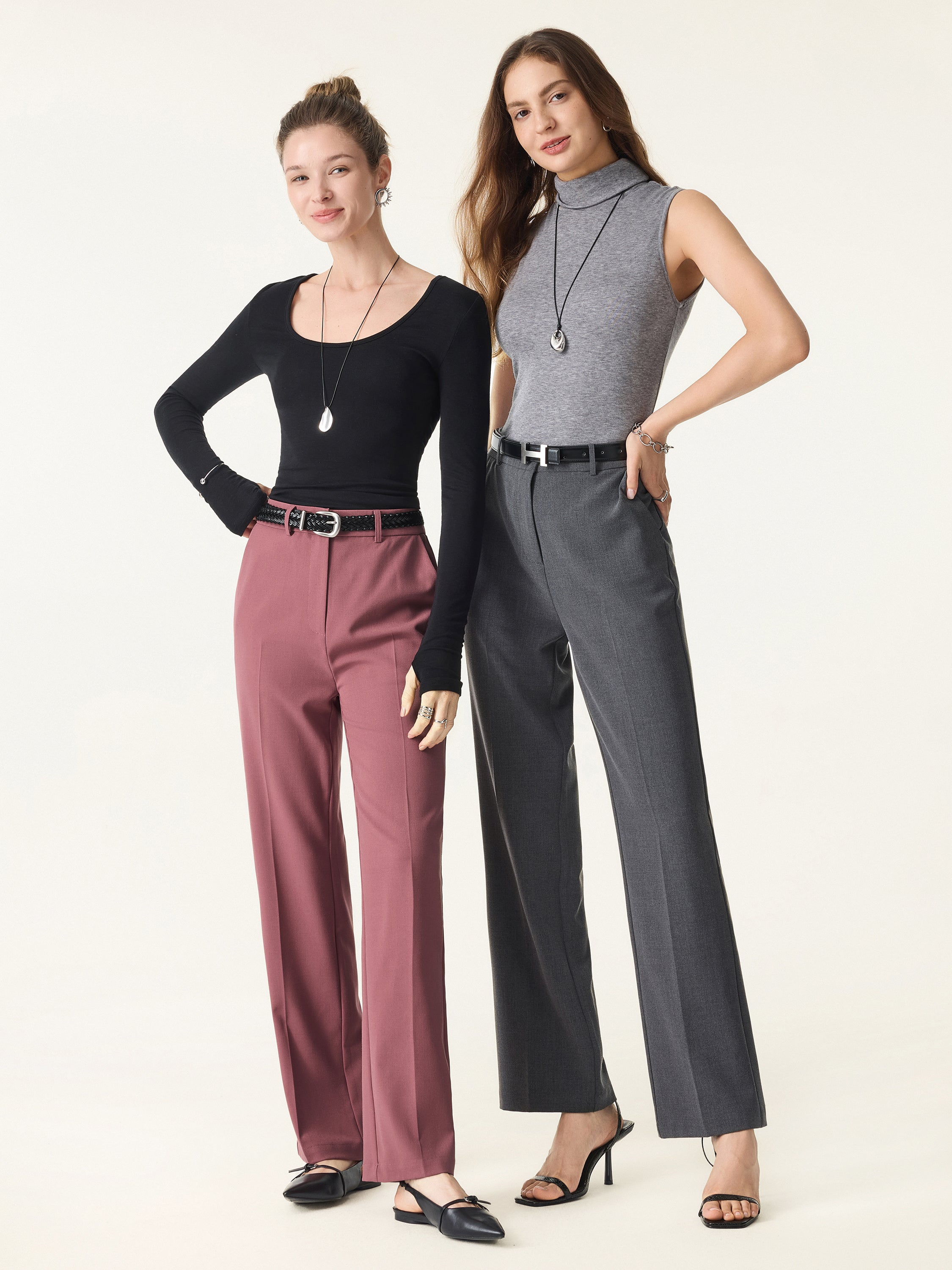 Wrinkle-Resistant Mid Rise Straight Leg Pants with Pockets
